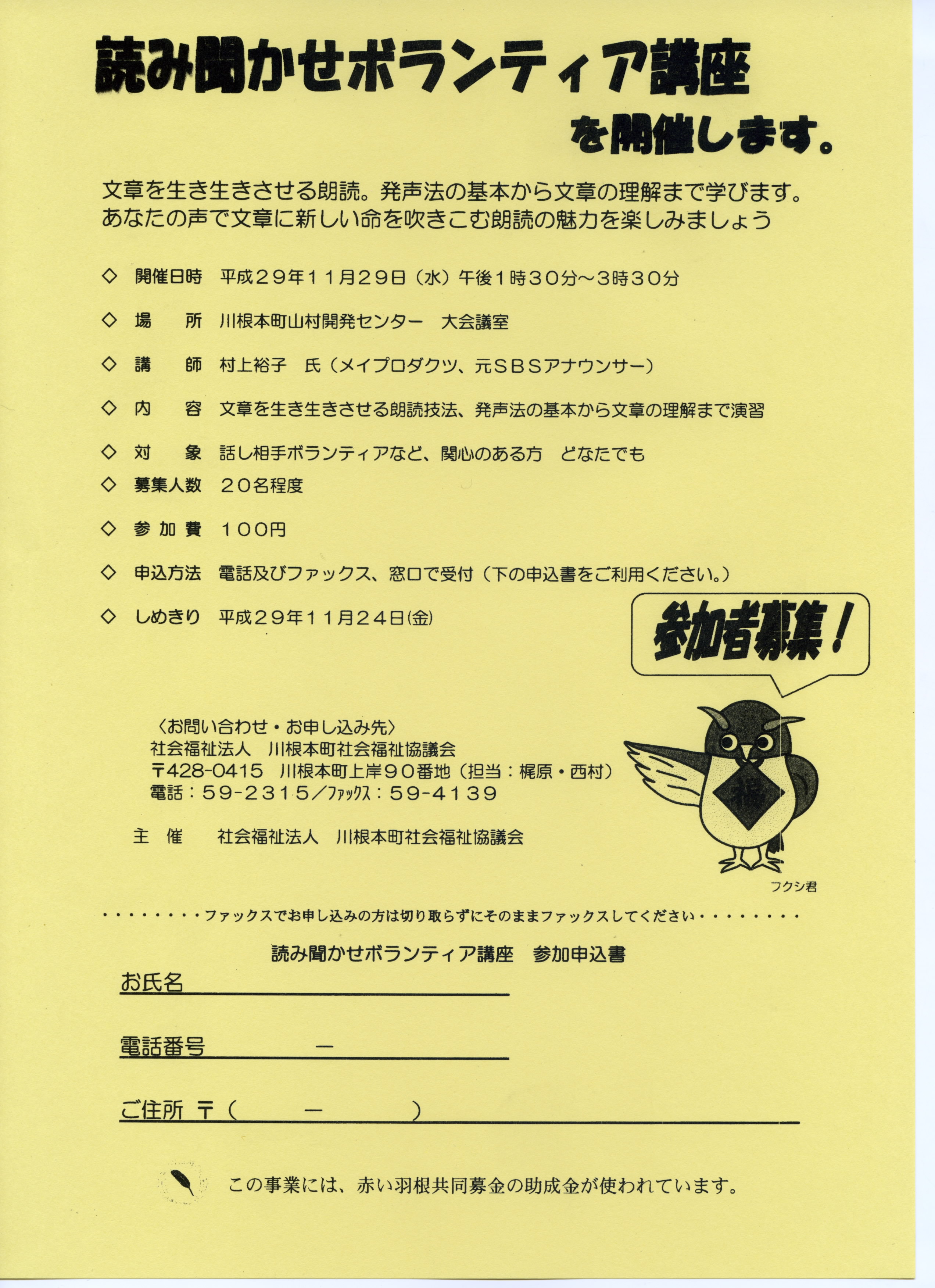 11月29日(水)に山村開発センターにて読み聞かせボランティア講座を開催します。 文藻を生き生きさせる朗読。発声法の基本から文章の理解までを学びます。 あなたの声で文章に新しい命を吹き込む朗読の魅力を楽しみましょう。